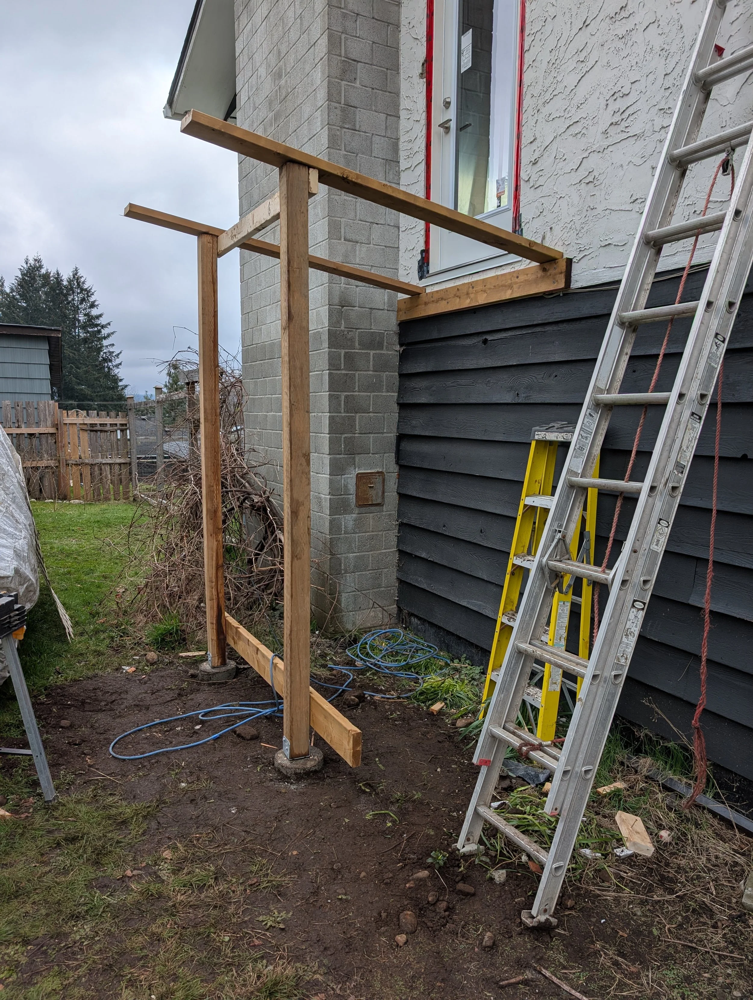 Posts were set on concrete piers with standoff brackets to keep wood elevated off the ground—preventing moisture wicking and reducing long-term rot risk.
