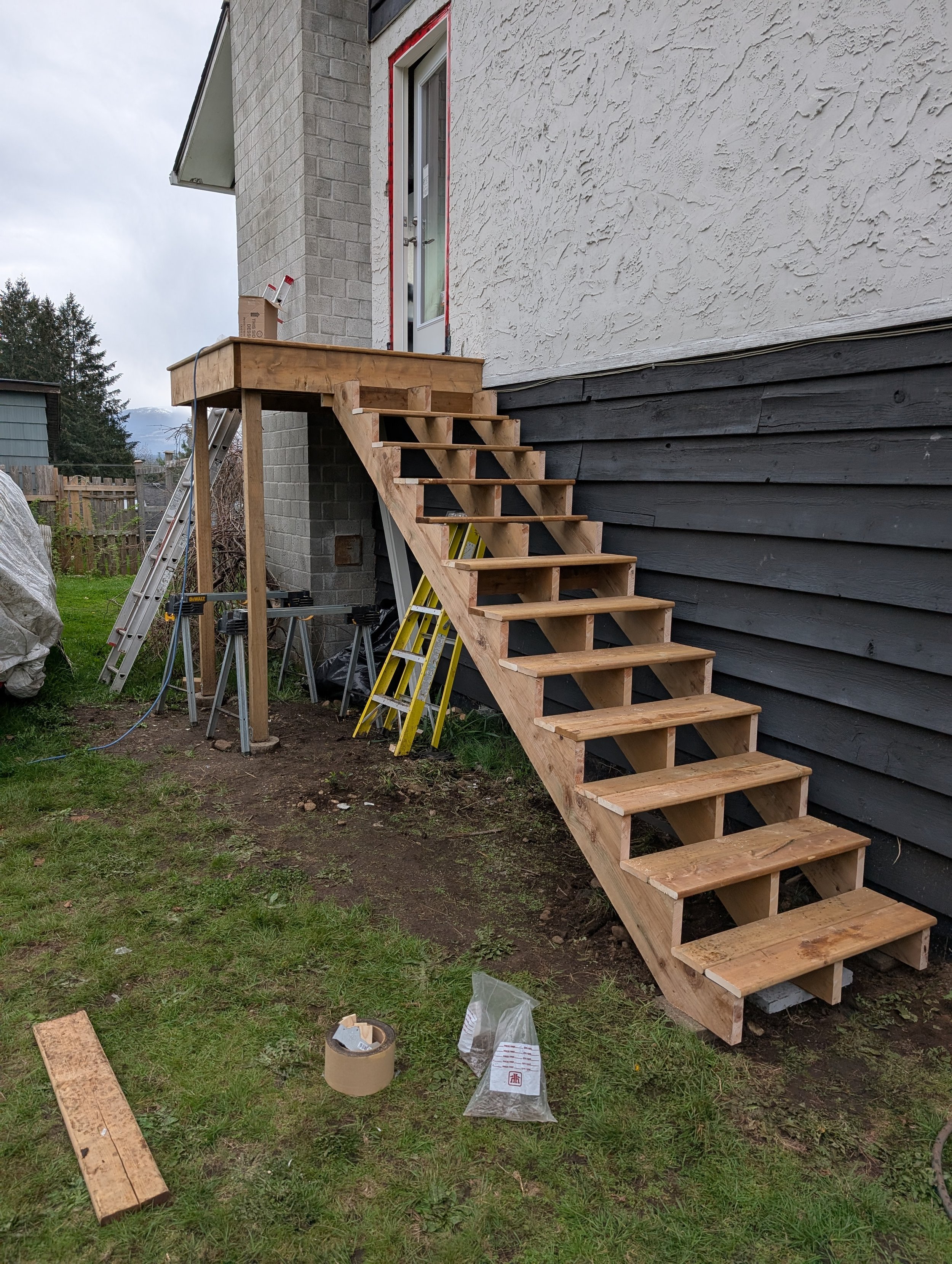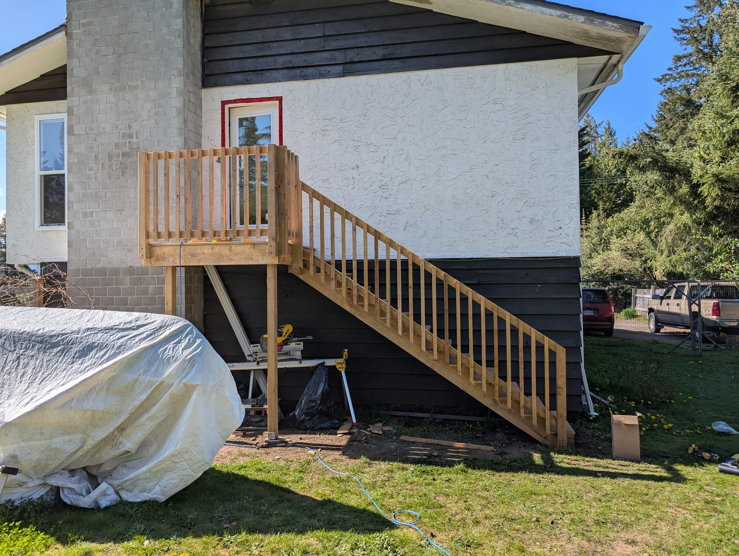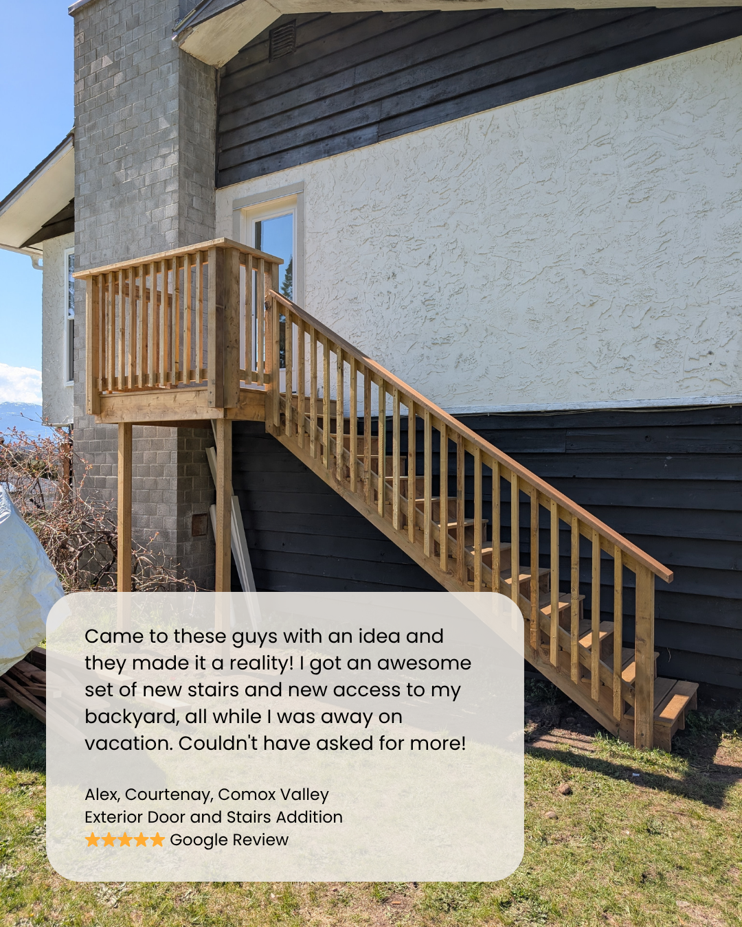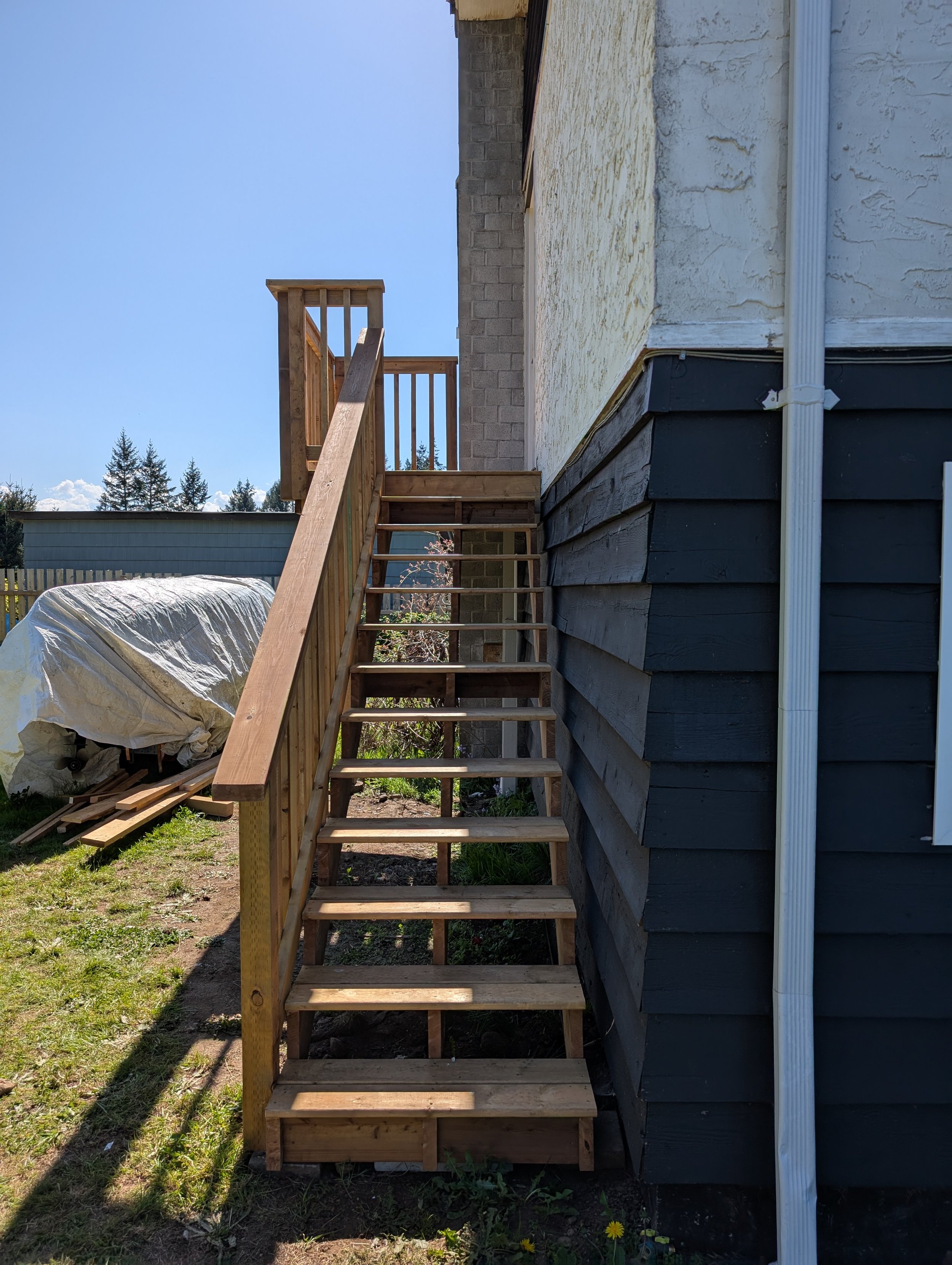 Pressure-treated lumber was used throughout this project to ensure the structure can handle moisture, insects, and the changing coastal climate of the Comox Valley. It’s specifically treated to resist rot and decay, which is essential for anything exposed to the elements — like stairs, landings, and railings.