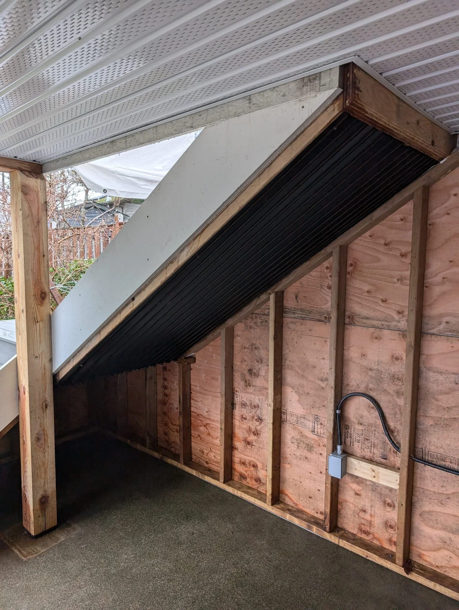 ✔️ Installed corrugated metal under the stairs to deflect water and protect storage