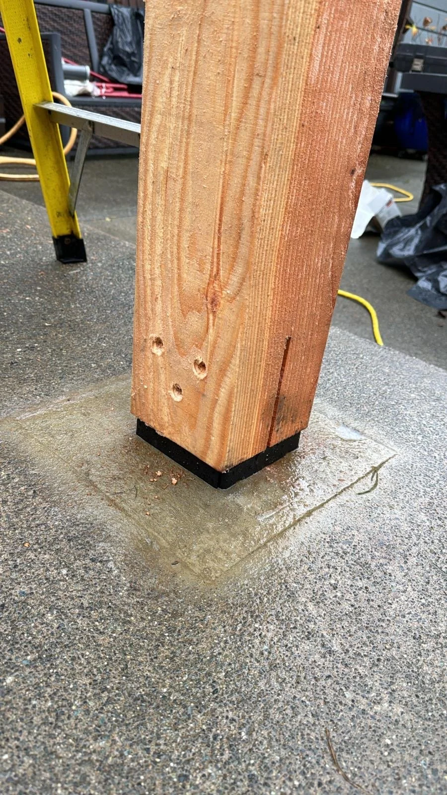 This original support post sat directly on the concrete pad, allowing moisture to wick into the wood, a common cause of premature rot.