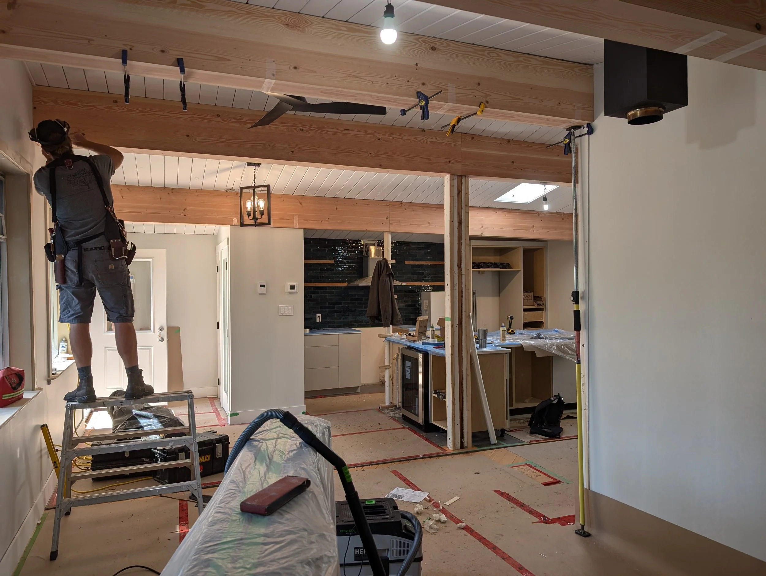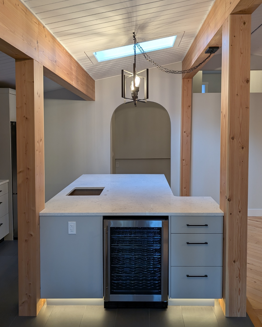 The client wanted to paint the walls white. The structural posts and beams were cladded with MDF and painted white, so to bring warmth we removed the MDF and wrapped with locally sourced timber.